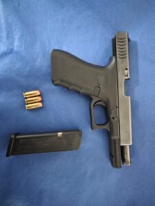 Durante esta intervención se aseguró un arma de fuego corta calibre .40 milímetros, un cargador para arma corta, tres cartuchos calibre .40 milímetros y 14 bolsas de plástico con una sustancia granulosa con características propias de la metanfetamina.