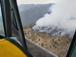*Tancítaro, Michoacán, 21 de mayo de 2025.-* Fortalece el Gobierno de Michoacán la línea de combate con 60 brigadistas y un helicóptero con helibalde para la extinción del incendio ubicado en el predio La Majada dentro del Área Natural Protegida del Pico de Tancítaro.