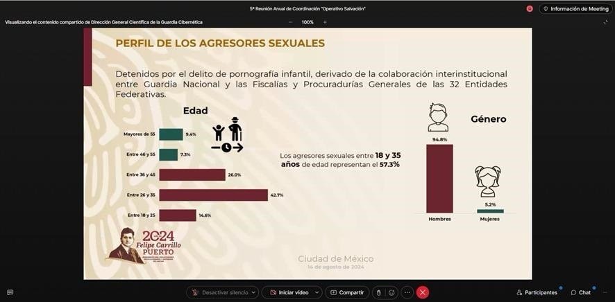 Finalmente, el Fiscal General destacó la importancia de mantener la aplicación de buenas prácticas, como el desarrollo de estrategias y acciones coordinadas entre instancias de seguridad y justicia de los tres órdenes de gobierno; tal como la constante vinculación que existe con organismos como la Guardia Nacional (GN) y el Buró Federal de Investigación (FBI), a través de la Embajada de Estados Unidos en México, resaltando además la coordinación con la asociación civil Centro Nacional de Niños Desaparecidos y Explotados Sexualmente (NCMEC), la cual está autorizada para procesar reportes de transmisión de pornografía infantil, a través de plataformas digitales como Facebook o Google.