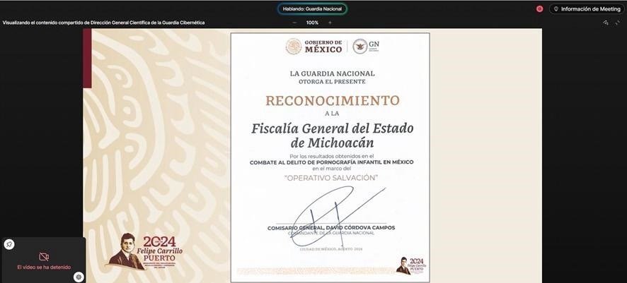 *Morelia, Michoacán, a 18 de agosto de 2024.-* Tras llevar a cabo la quinta Reunión Anual de Coordinación del “Operativo Salvación” con la Guardia Nacional (GN), la Fiscalía General del Estado de Michoacán (FGE) recibió, por cuarto año consecutivo, un reconocimiento a la colaboración del personal de la Unidad de Investigación de Delitos de Trata de Personas, por los resultados obtenidos en el combate al delito de pornografía infantil en la entidad.