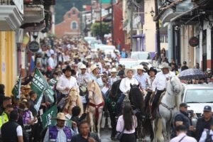 El/ INFOMANIA/ URUAPAN, MICH./ DOM-10-AGO-2025/ Una cabalgata con música, danza y el colorido de los trajes regionales fue el marco previo el primer informe de gobierno independiente que encabeza Carlos Manzo, el del sombrero.