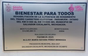 CUITZITAN (Salvador Escalante), Michoacán, 10 de abril de 2026.- Las autoridades municipales, encabezadas por la alcaldesa Dayana Pérez Mendoza y vecinos de doce comunidades, participaron en la inauguración de la rehabilitación de la carretera, Cuitzitán-Paramuén-Íxtaro, en una longitud de 11 kilómetros y 600 metros.