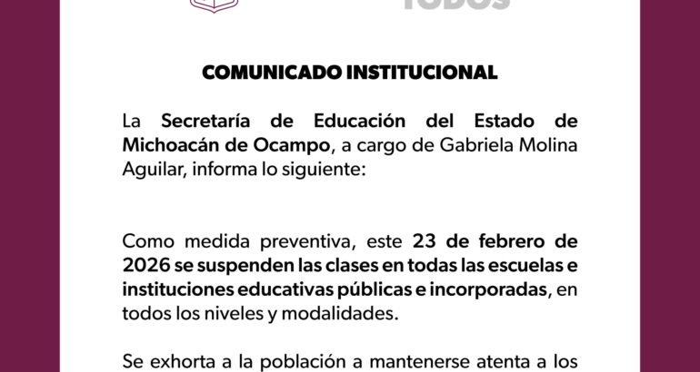 *Morelia, Michoac谩n, 22 de febrero de 2026.-* La secretaria de Educaci贸n del Estado, Gabriela Molina, informa que este lunes 23 de febrero se suspenden clases en todos los planteles p煤blicos e incorporados de Michoac谩n, como medida preventiva y con el objetivo de resguardar la integridad de ni帽as, ni帽os, j贸venes, docentes y trabajadores de la educaci贸n.