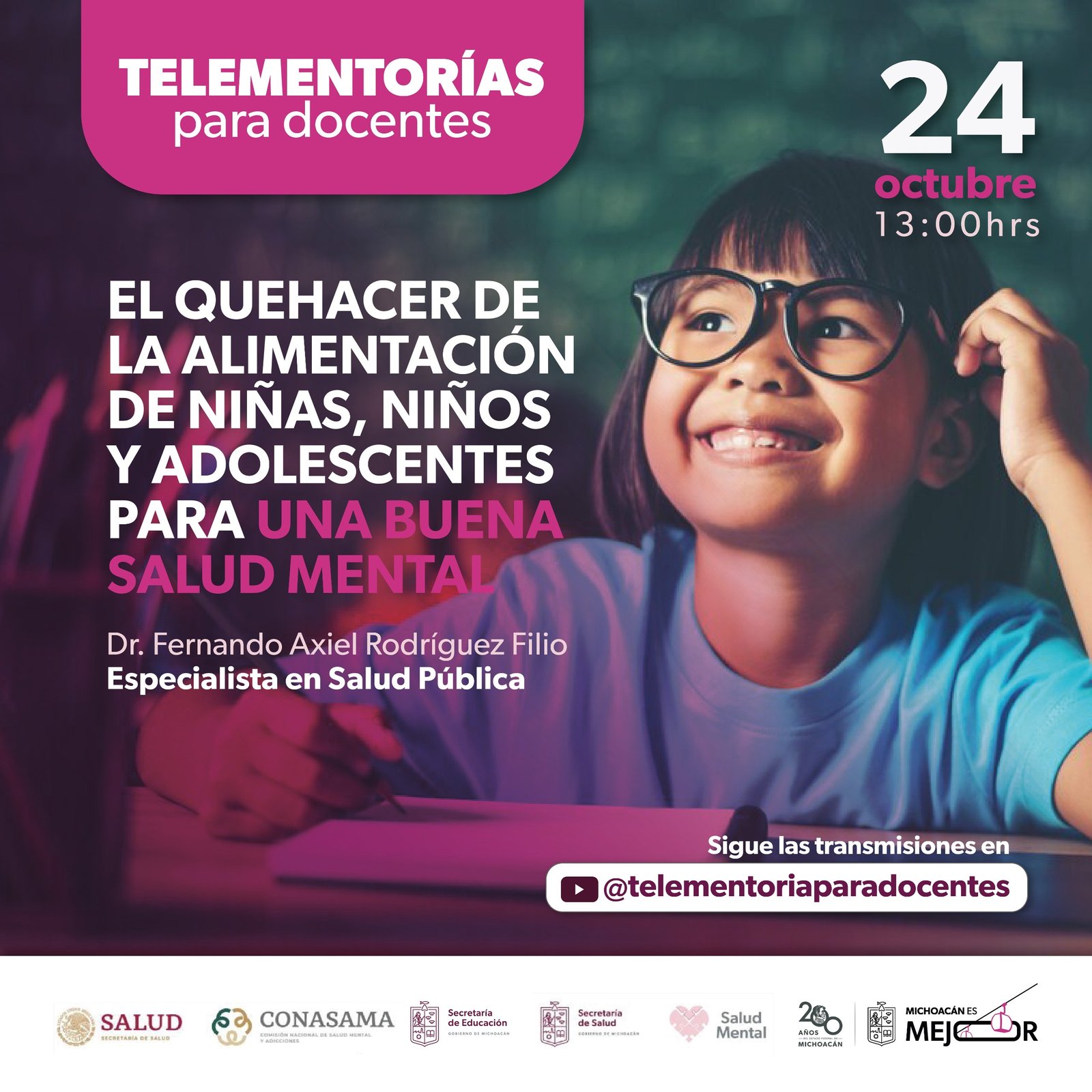 *Morelia, Michoacán, 23 de octubre de 2024.-* La Secretaría de Educación del Estado (SEE) invita al público en general a la telementoría denominada, El quehacer de la alimentación de niñas, niños y adolescentes para una buena salud mental, que se puede seguir a través de la plataforma YouTube.