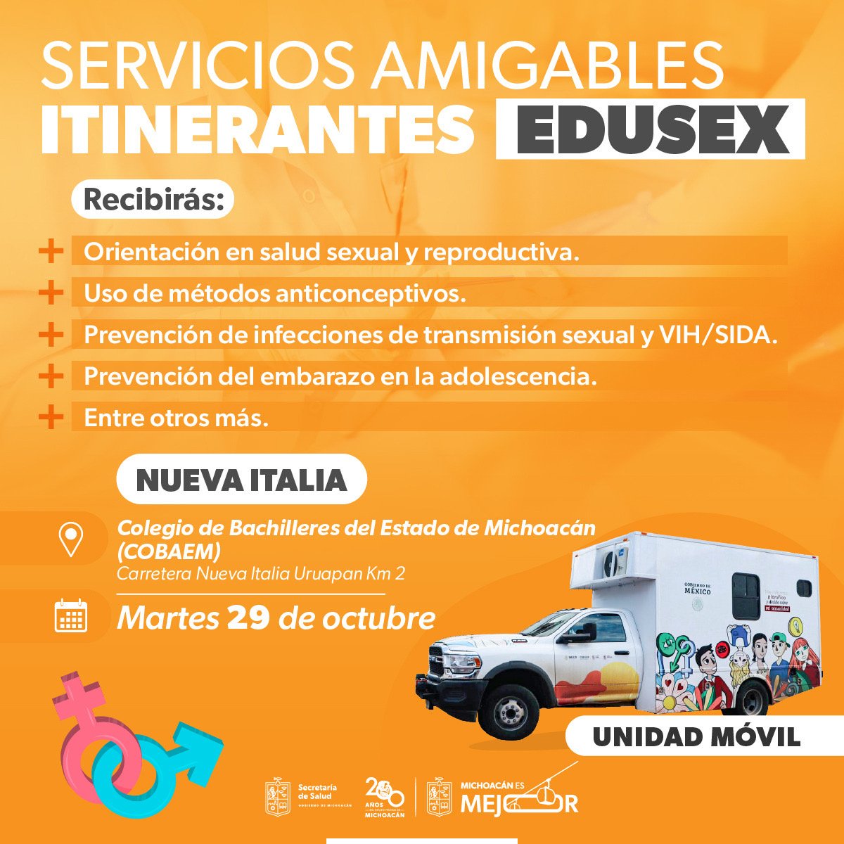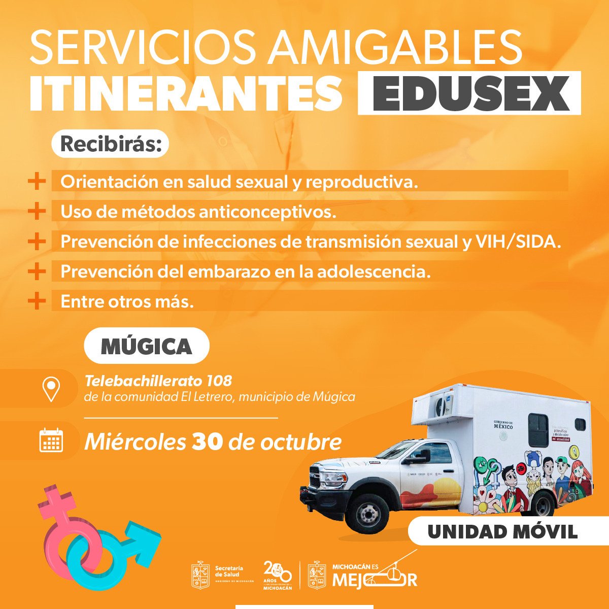 El servicio se otorgará de forma gratuita en una unidad móvil Edusex, equipada con consultorio y personal médico, para que las y los jóvenes puedan resolver sus dudas respecto a la prevención de infecciones y el uso adecuado de métodos de planificación familiar de corto y largo plazo como el condón, el implante subdérmico y las inyecciones anticonceptivas.