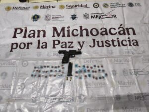 *Uruapan, Michoacán, 11 de marzo de 2026.-* En una acción operativa, agentes de la Secretaría de Seguridad Pública de Michoacán (SSP) detuvieron a un hombre y aseguraron a dos adolescentes que se encontraban en posesión de un arma de fuego y 54 dosis de una sustancia granulosa con características propias de la metanfetamina.