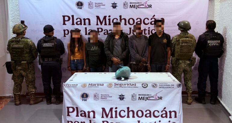 *Morelia, Michoacán, 23 de enero de 2026.-* En un operativo conjunto entre las secretarías de Seguridad Pública (SSP) y de la Defensa Nacional (Defensa), fueron detenidas cinco personas, tres hombres y dos mujeres, en posesión de droga y un vehículo con los medios de identificación alterados. Entre los detenidos se identificó a un presunto integrante de una célula delictiva dedicada en el robo de vehículos.