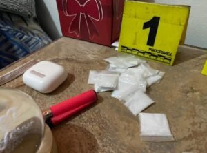En la acción fueron localizados 46 envoltorios con sustancia granulada con características propias de metanfetamina, con un peso aproximado de 45 gramos, así como un envoltorio con polvo blanco con características de cocaína. Asimismo, se aseguraron ocho teléfonos celulares, una tableta electrónica y dos placas de circulación.