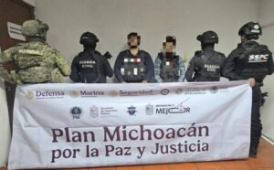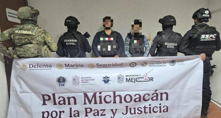 *Morelia, Michoacán, 8 de enero de 2026.-* Mediante labores conjuntas de inteligencia e investigación, agentes de las secretarías de Seguridad Pública (SSP), de Marina (Semar) y de Seguridad y Protección Ciudadana (SSPC) detuvieron en la colonia La Aldea, en Morelia, a dos hombres presuntamente vinculados a una célula delictiva.