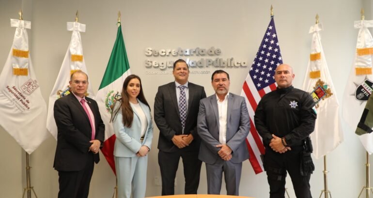 *Morelia, Michoacán, 24 de septiembre de 2025.-* El secretario de Seguridad Pública (SSP), Juan Carlos Oseguera Cortés, recibió a representantes de la Embajada de los Estados Unidos de América (EUA), con la finalidad de fortalecer los lazos de cooperación en materia de capacitaciones y coordinación a favor de la estrategia operativa en Michoacán.