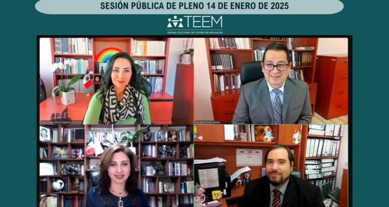 Morelia, Michoacán a 14 de enero de 2024.- El Tribunal Electoral del Estado (TEEMICH) realizó dos sesiones públicas el día de hoy; en la primera la Magistrada Presidenta Alma Rosa Bahena Villalobos, la Magistrada Yurisha Andrade Morales y el Magistrado Everardo Tovar Valdez analizaron un juicio ciudadano y tres procedimientos especiales sancionadores por presuntos actos de violencia política contra las mujeres en razón de género.