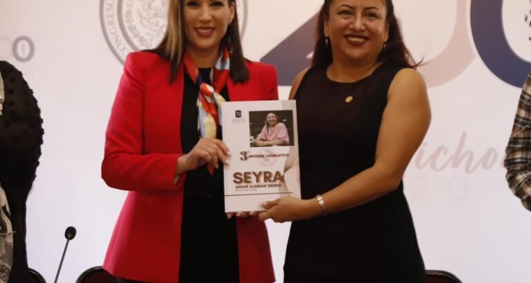 En el informe que ofreció en el Salón de Recepciones del Congreso del Estado, Seyra Alemán hizo entrega a la presidenta de la Mesa Directiva de la 75 Legislatura, Laura Ivonne Pantoja, del documento que contiene su informe de actividades, en un acto en el que también estuvieron presentes la diputada Julieta García Gallardo; el secretario de Asuntos Parlamentarios, Raymundo Arreola Ortega; la diputada Electa por Maravatío, Jaqueline Avilés; y Víctor Montelongo, Coordinador Territorial en Morelia, así como invitados especiales.