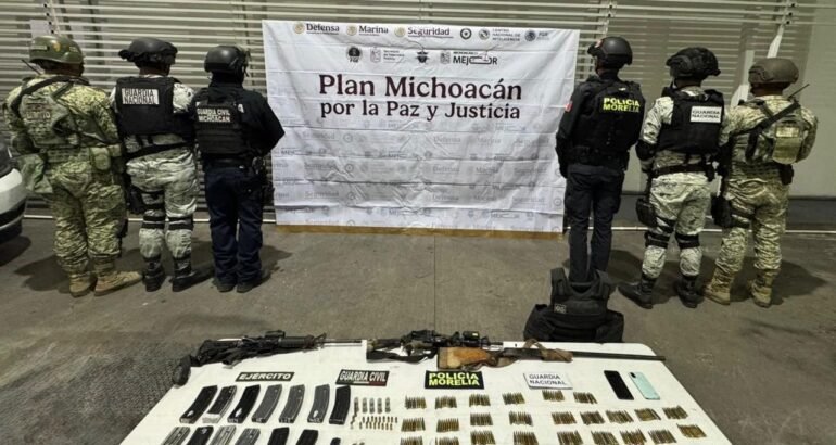 *Tarímbaro, Michoacán, 27 de noviembre de 2025.-* Derivado de las acciones operativas del Plan Michoacán por la Paz y la Justicia, en el municipio de Tarímbaro, elementos de las secretarías de Seguridad Pública (SSP) y de la Defensa Nacional (Defensa), aseguraron tres armas de fuego, más de 300 municiones y droga luego de responder una agresión armada.