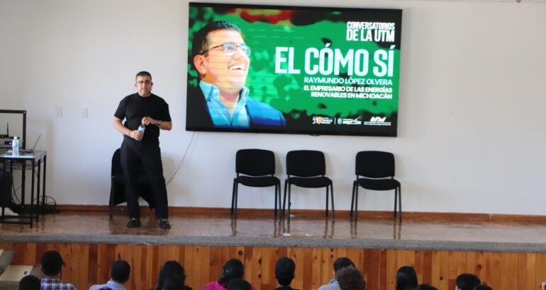 Durante la conferencia, López Olvera expuso su experiencia profesional en los sectores de energía renovable, vivienda y ecología, así como los retos que enfrentó en su trayectoria empresarial. Explicó cómo identificó oportunidades de crecimiento y desarrollo en Michoacán a partir de la innovación tecnológica y el aprovechamiento responsable de los recursos.