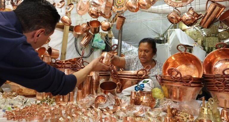 El artesano Jeovany Punzo Cázares, del pueblo mágico de Santa Clara del Cobre, agradeció la oportunidad de participar en el Tianguis de Domingo de Ramos y expresó que este espacio representa una oportunidad fundamental para todo el sector artesanal para fortalecer su economía familiar.