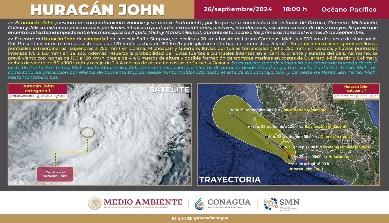 El corte de las 18:00 horas, el meteoro se localizaba frente a la Costa Michoacana a 90 kilómetros al oeste de Lázaro Cárdenas, con vientos máximos sostenidos de 120 km/h, rachas de 150 km/h y desplazamiento hacia el noroeste a 5 km/h.