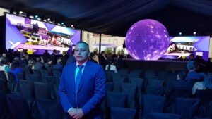 Durante la presentación del Informe, Alfonso Martínez se apoyó de inteligencia artificial, a través de la asistente bautizada “Lía”, para la proyección de imágenes en 4 pantallas planas gigantes y una pantalla esférica central.