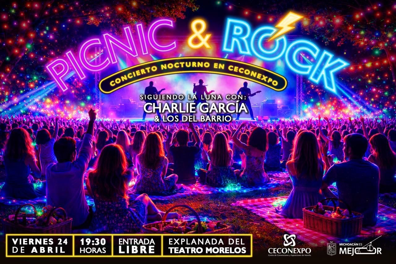 *Morelia, Michoacán, 22 de abril de 2026.-* El Centro de Convenciones y Exposiciones de Morelia (Ceconexpo) invita al evento «Picnic & Rock: Siguiendo la Luna», que se realizará el viernes 24 de abril a las 19:30 horas en la explanada del Teatro Morelos, con acceso libre.
